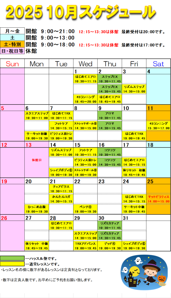 メディカルフィットネス信愛 10月スケジュール (開館・レッスン等)